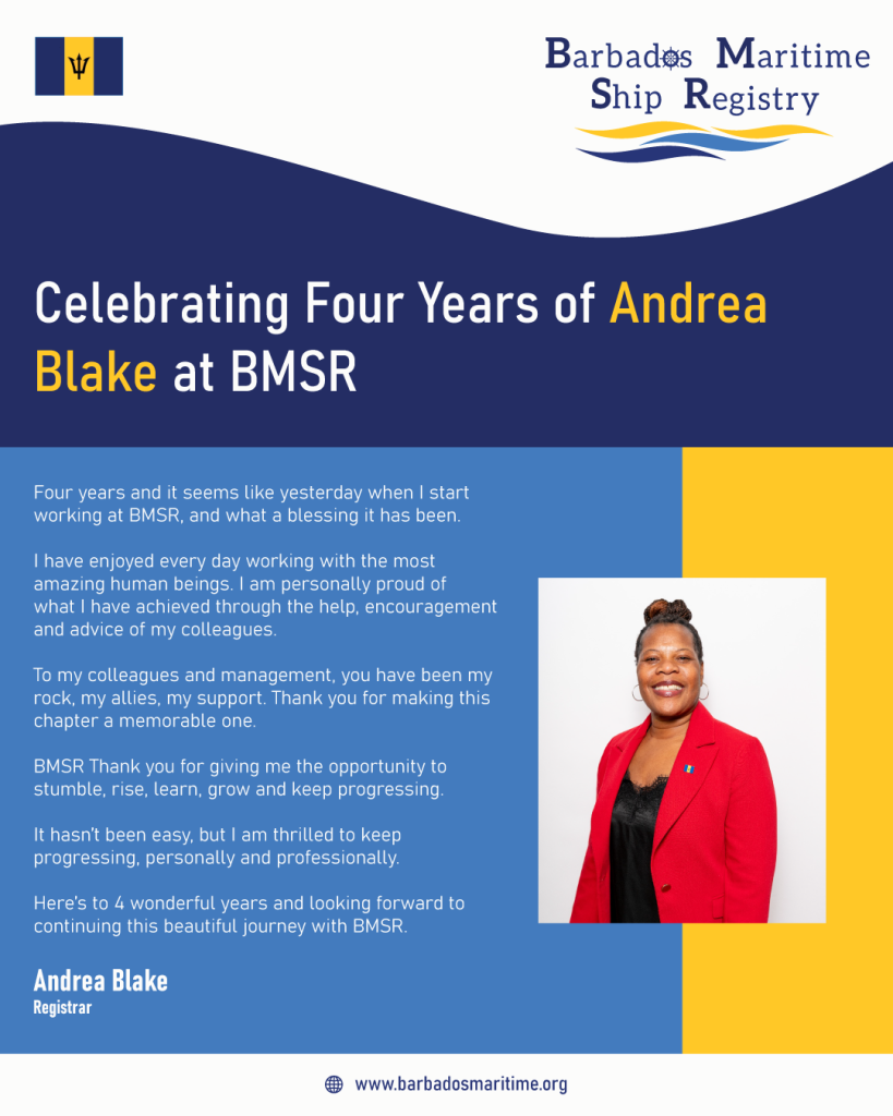 We are excited to celebrate Andrea Blake’s four-year anniversary as Registrar at the Barbados Maritime Ship Registry (BMSR).