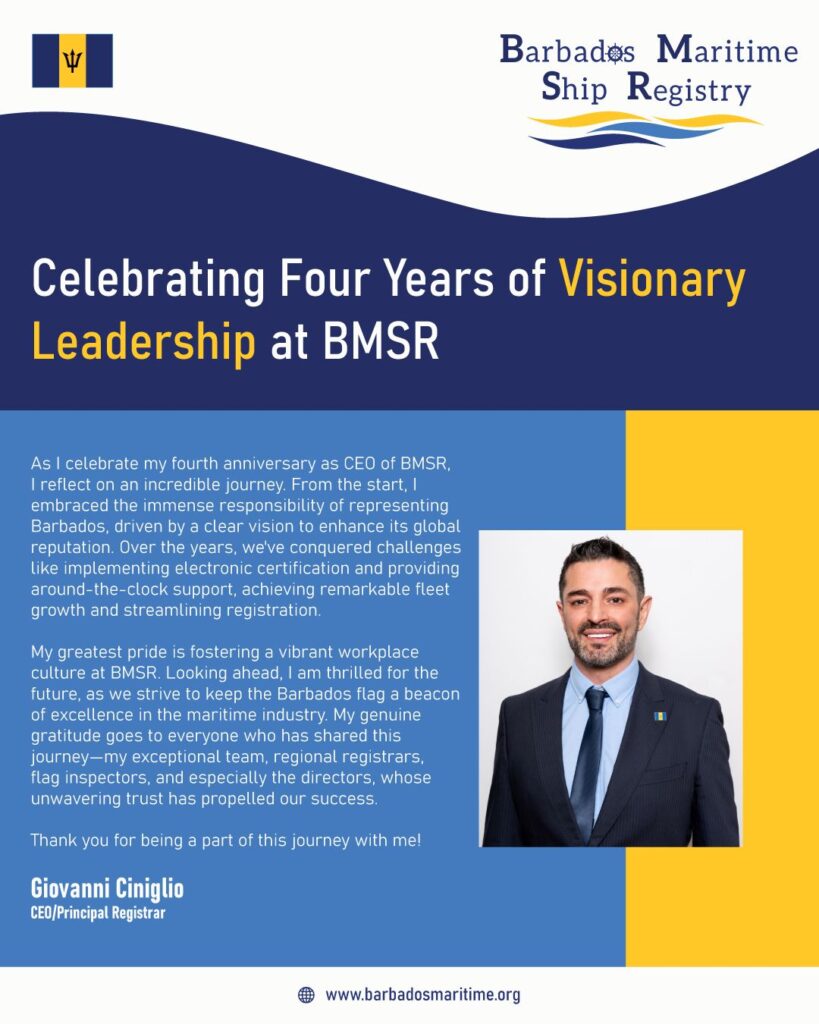 We proudly celebrate Giovanni Ciniglio four-year anniversary as CEO and Principal Registrar of the Barbados Maritime Ship Registry.